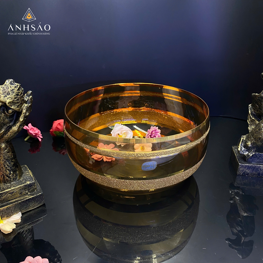 Mẫu âu pha lê viền vàng nổi bật với gam màu hổ phách ấm áp, kết hợp đường viền ánh kim tinh xảo, mang đến cảm giác sang trọng và quyền quý. Sản phẩm phù hợp để trưng bày trái cây, bánh kẹo trong những buổi tiệc cao cấp hoặc làm vật trang trí trung tâm bàn phòng khách. Chất pha lê dày dặn, bề mặt mịn và khả năng phản chiếu ánh sáng tốt giúp không gian trở nên ấm cúng và đẳng cấp hơn.