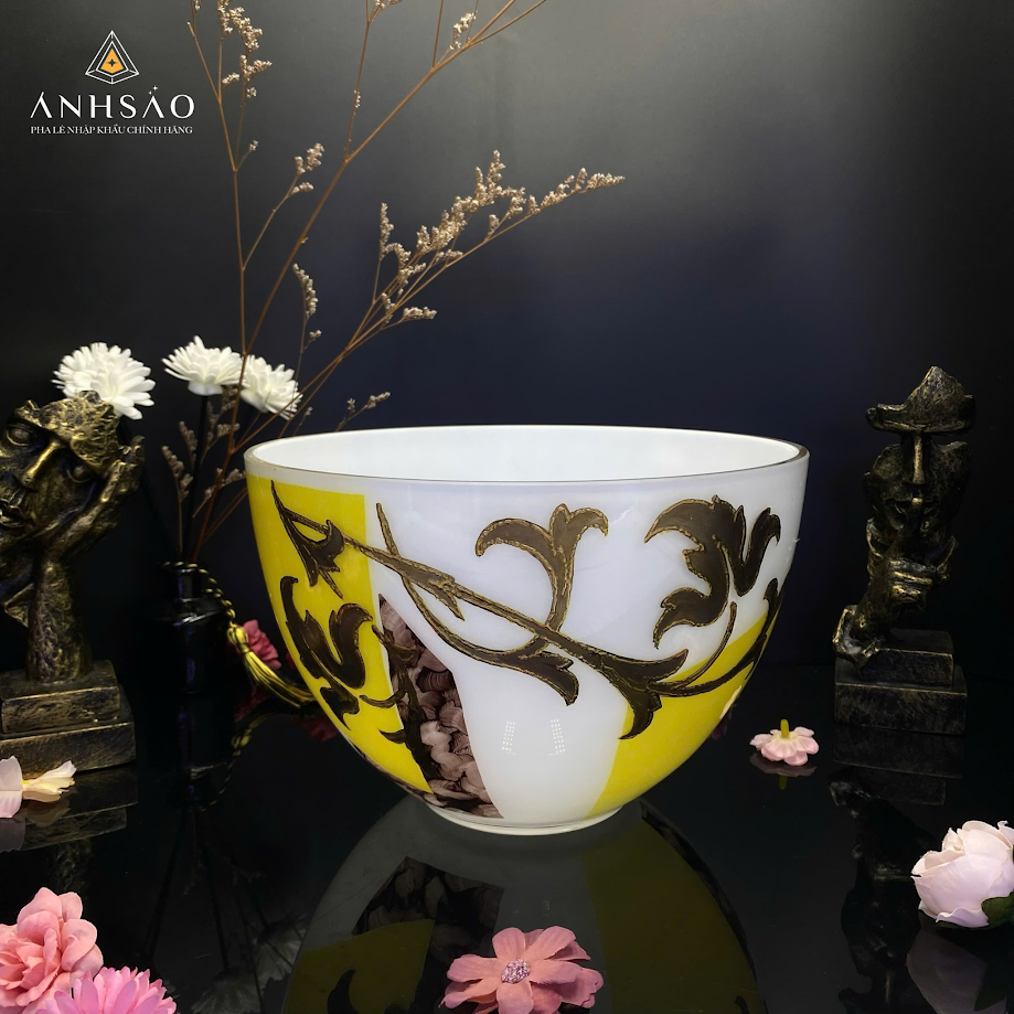 Âu pha lê họa tiết nghệ thuật màu vàng gây ấn tượng bởi sự kết hợp hài hòa giữa sắc màu nổi bật và các đường nét mềm mại. Thiết kế mang hơi hướng cổ điển, tạo cảm giác ấm áp và sang trọng cho không gian trưng bày. Âu pha lê này thích hợp dùng để đựng trái cây, bánh kẹo hoặc làm điểm nhấn trên bàn tiếp khách. Khi đặt dưới ánh sáng, sản phẩm phản chiếu lung linh, góp phần nâng tầm giá trị thẩm mỹ cho không gian sống.