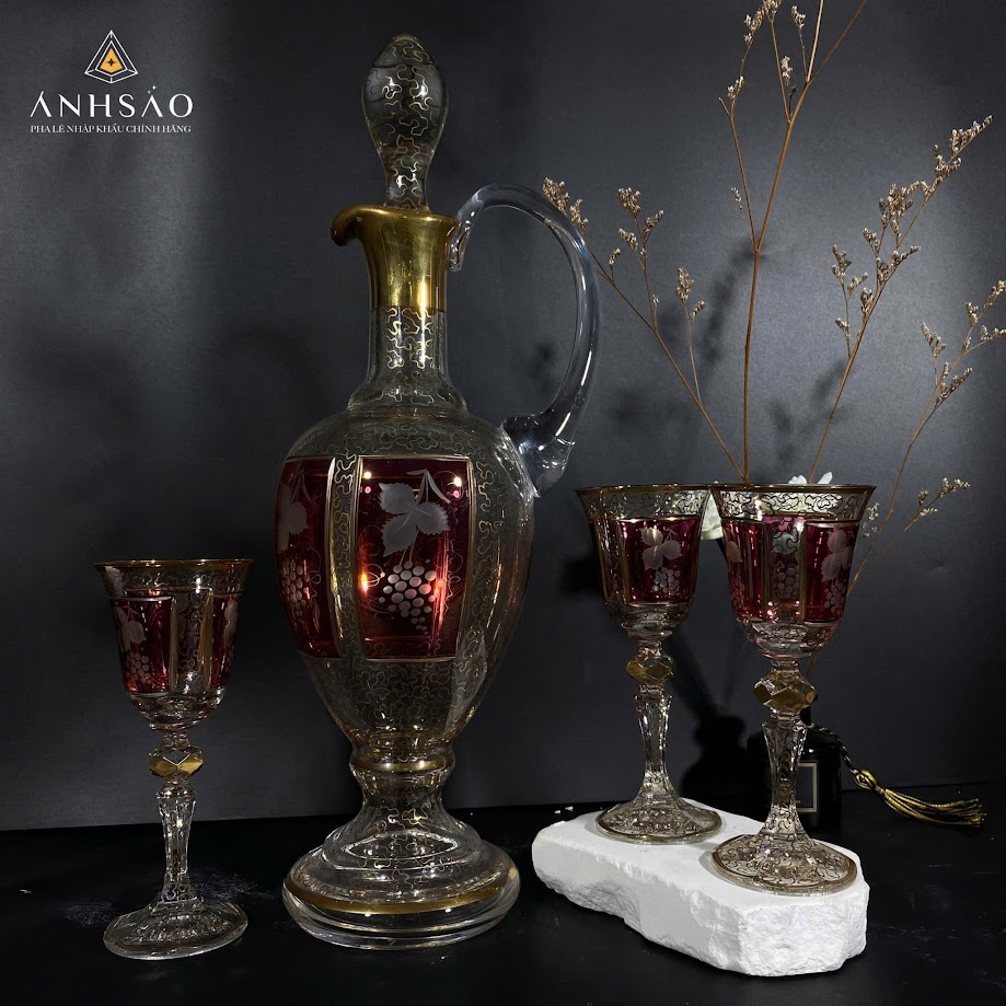 Mẫu bộ bình rượu pha lê đầu tiên gây ấn tượng với gam màu đỏ ruby quyến rũ kết hợp họa tiết hoa vẽ tay tinh xảo. Phần thân bình được tạo dáng mềm mại, cổ cao thanh thoát, nắp pha lê cắt gọt sắc nét giúp bảo quản rượu tốt hơn. Đi kèm là các ly đồng bộ, tạo nên tổng thể hài hòa và sang trọng. Sản phẩm rất phù hợp với những ai yêu thích phong cách cổ điển, lãng mạn và muốn tạo điểm nhấn nổi bật cho bàn tiệc hoặc tủ rượu.
