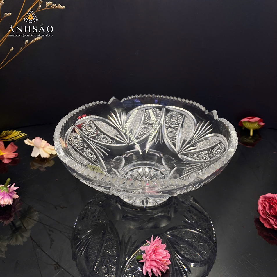 Đặc điểm nổi bật: Đây là một chiếc âu pha lê trong suốt với hoa văn được cắt gọt cầu kỳ, đối xứng hoàn hảo, đặc trưng là các đường cắt hình lá, hình quạt hoặc lưới kim cương. Phần miệng được mài răng cưa tinh tế, tạo độ bắt sáng tối đa.