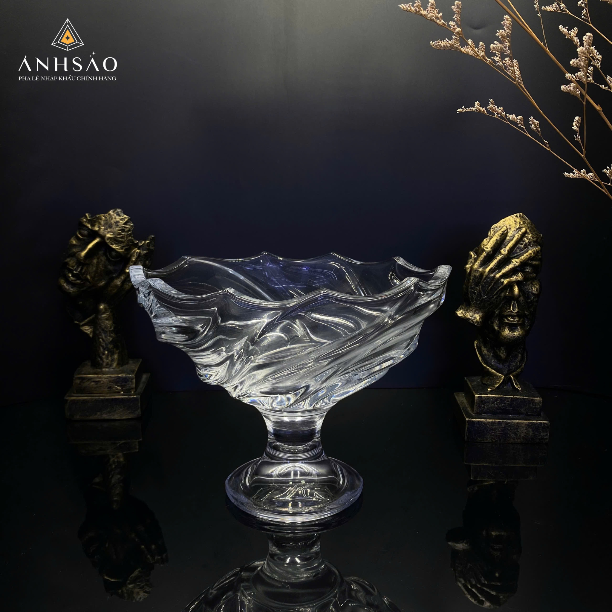 Điểm nhấn đầu tiên trong bộ sưu tập là âu pha lê sóng – thiết kế mềm mại với các đường uốn lượn như sóng nước, tạo nên vẻ đẹp độc đáo và hiện đại. Chiếc âu pha lê này thích hợp để trưng bày trên bàn ăn, phòng khách hoặc sử dụng trong những buổi tiệc sang trọng, giúp không gian thêm phần ấn tượng.