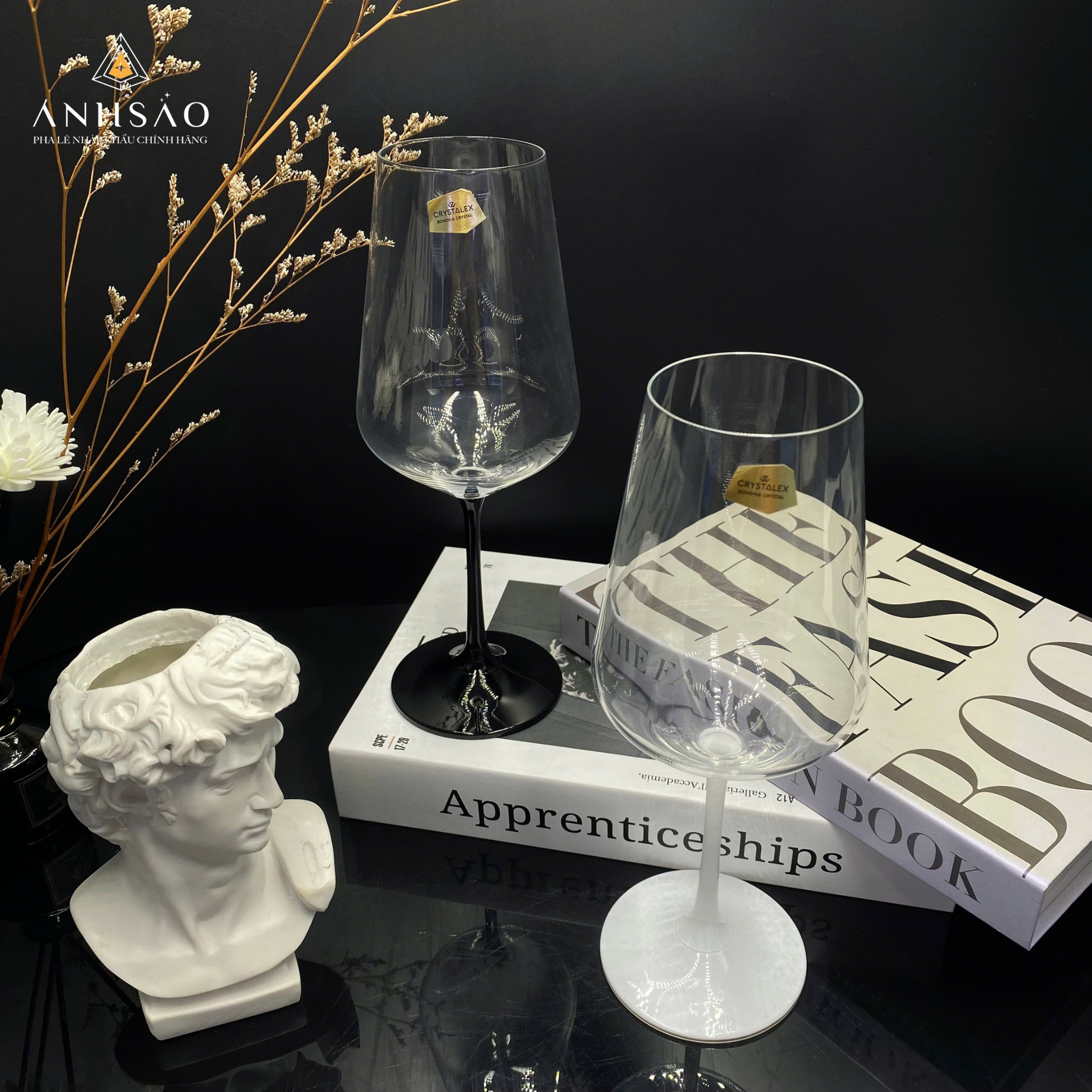 Điểm nhấn đầu tiên trong bộ sưu tập là ly pha lê chân đen trắng, thiết kế tối giản nhưng vô cùng tinh tế. Sự tương phản giữa hai gam màu mang lại cảm giác hiện đại, phù hợp cho không gian tiệc tối hay bữa ăn lãng mạn.