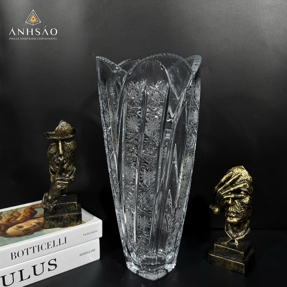 Mẫu lọ hoa pha lê này gây ấn tượng mạnh với các đường cắt khắc sâu, sắc nét và đối xứng hoàn hảo. Mỗi mặt pha lê phản chiếu ánh sáng tạo hiệu ứng lấp lánh sang trọng, giúp không gian trưng bày trở nên nổi bật hơn. Thiết kế dáng cao, miệng loe nhẹ rất phù hợp để cắm hoa tươi, hoa khô hoặc trưng bày độc lập như một tác phẩm nghệ thuật. Đây là lựa chọn lý tưởng cho phòng khách cao cấp, khách sạn hoặc biệt thự phong cách cổ điển – tân cổ điển.