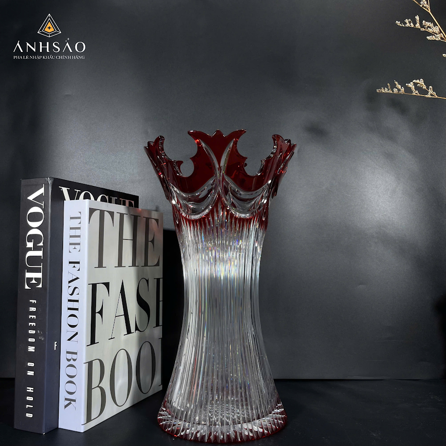 Mẫu lọ hoa pha lê thứ ba nổi bật với gam màu đỏ ruby quyến rũ kết hợp thân pha lê trong suốt có các đường sọc dọc tinh tế. Phần miệng lọ được tạo hình uốn lượn mềm mại, mang lại cảm giác quý phái và ấn tượng mạnh về thị giác. Đây là mẫu lọ hoa pha lê rất được ưa chuộng để trang trí phòng khách, bàn tiệc hoặc làm quà tặng trong các dịp đặc biệt như tân gia, khai trương hay lễ Tết.