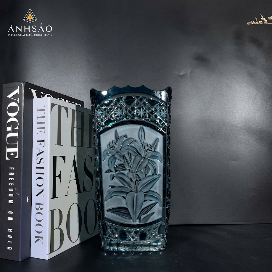 Mẫu lọ hoa pha lê đầu tiên gây ấn tượng với họa tiết hoa ly được chạm khắc nổi vô cùng sắc nét. Thân lọ có gam màu xanh khói sang trọng, kết hợp các đường cắt kim cương tinh tế ở viền trên và chân đế. Thiết kế này mang phong cách cổ điển pha chút hiện đại, phù hợp đặt tại phòng khách, kệ trang trí hoặc bàn tiếp khách. Khi kết hợp cùng ánh sáng tự nhiên hay đèn chiếu, chiếc lọ hoa pha lê này tạo hiệu ứng phản quang lấp lánh, giúp không gian trở nên cuốn hút và đẳng cấp hơn.