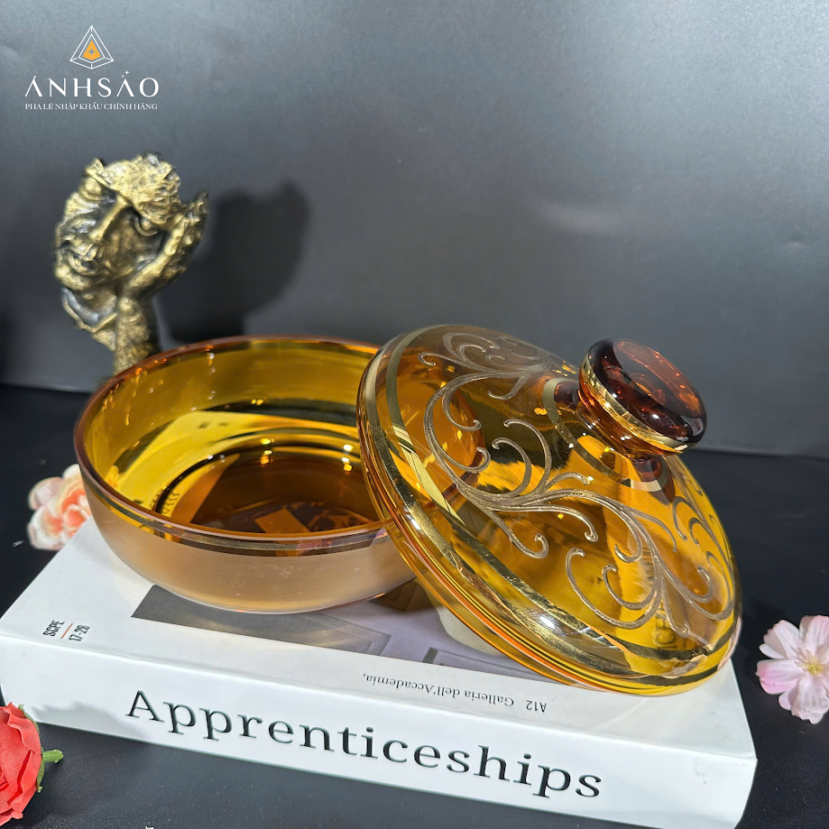 Mẫu âu mứt pha lê màu hổ phách gây ấn tượng bởi sắc vàng ấm áp, mang lại cảm giác sang trọng và cổ điển. Thiết kế tròn hài hòa cùng phần nắp được chạm khắc hoa văn mềm mại giúp sản phẩm trở nên tinh xảo và thu hút ánh nhìn. Gam màu hổ phách không chỉ dễ phối với nhiều phong cách nội thất mà còn tạo cảm giác ấm cúng, rất phù hợp để trưng bày trong phòng khách hoặc phòng trà. Đây là lựa chọn lý tưởng cho những ai yêu thích vẻ đẹp nhẹ nhàng nhưng vẫn đẳng cấp.