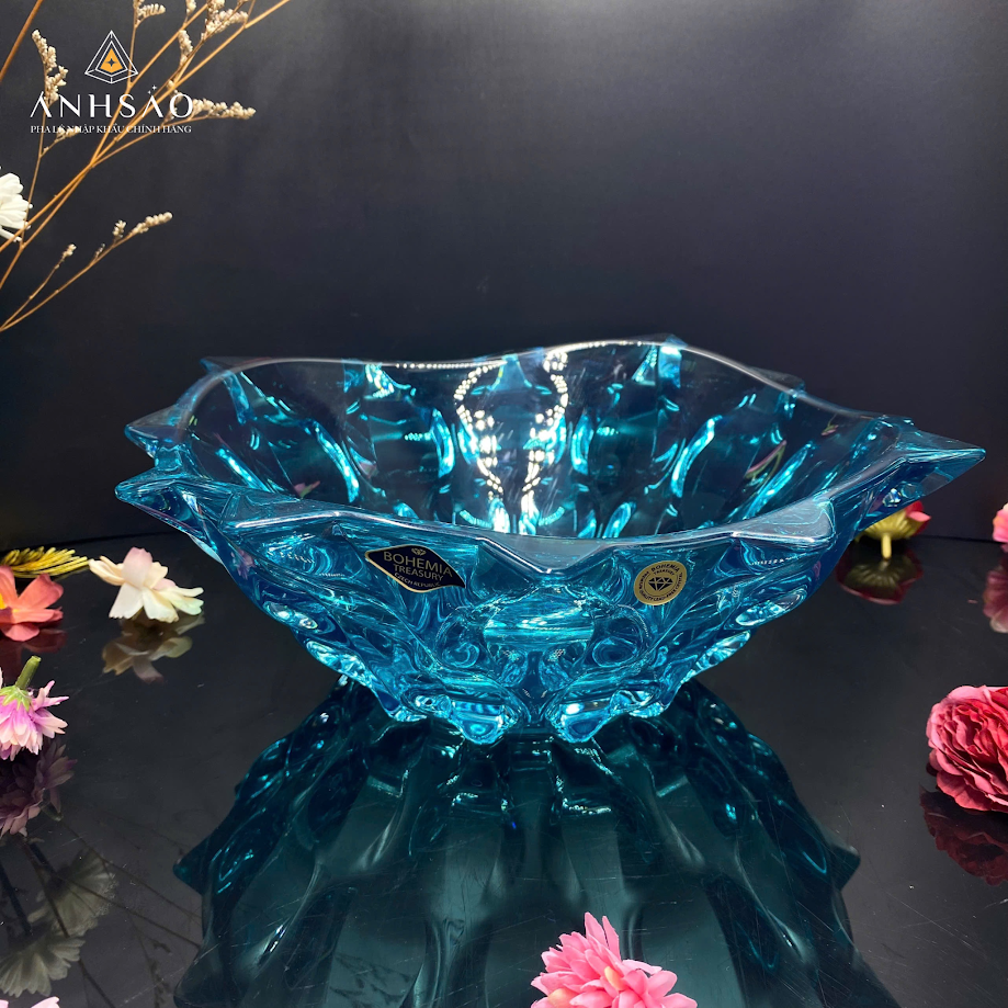 Chiếc âu pha lê xanh Bohemia mang phong cách hiện đại, nổi bật với gam màu xanh biển trong suốt và những đường nét uốn lượn mềm mại. Sản phẩm được chế tác từ pha lê cao cấp nhập khẩu, phản chiếu ánh sáng lung linh, tạo hiệu ứng huyền ảo khi đặt trong không gian sang trọng. Đây là lựa chọn hoàn hảo để bày hoa quả, bánh kẹo hoặc làm quà tặng cao cấp trong các dịp lễ, Tết.