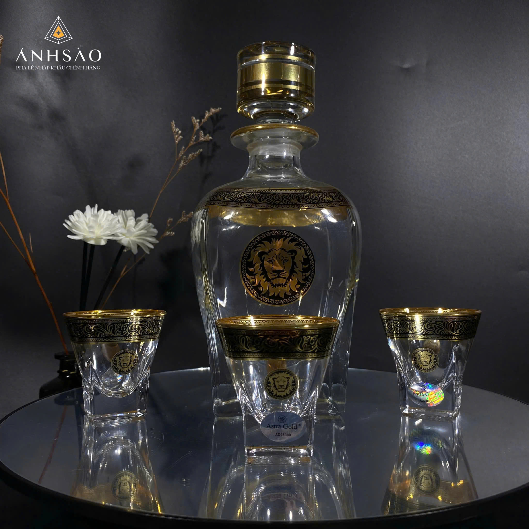Thiết kế đầu tiên gây ấn tượng bởi các đường cắt góc cạnh mạnh mẽ kết hợp cùng hoa văn mạ vàng sang trọng. Phần thân và ly được tạo hình khối độc đáo, mang phong cách hoàng gia châu Âu. Ánh sáng phản chiếu qua lớp pha lê trong suốt tạo nên hiệu ứng lấp lánh đầy cuốn hút. Đây là mẫu Bộ bình rượu pha lê phù hợp cho những ai yêu thích vẻ đẹp cổ điển nhưng vẫn muốn điểm nhấn khác biệt trong không gian.
