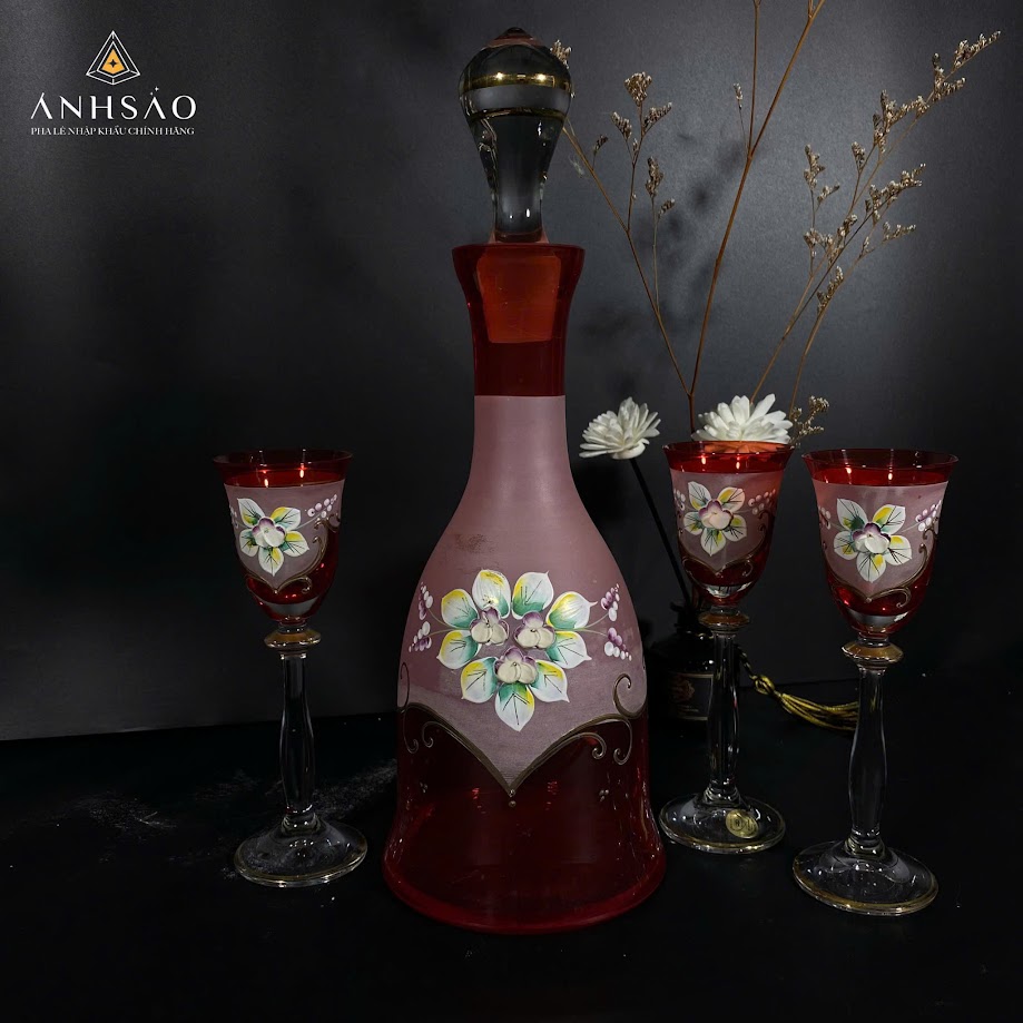 Mẫu bộ bình rượu pha lê đầu tiên gây ấn tượng với gam màu đỏ ruby quyến rũ kết hợp họa tiết hoa vẽ tay tinh xảo. Phần thân bình được tạo dáng mềm mại, cổ cao thanh thoát, nắp pha lê cắt gọt sắc nét giúp bảo quản rượu tốt hơn. Đi kèm là các ly đồng bộ, tạo nên tổng thể hài hòa và sang trọng. Sản phẩm rất phù hợp với những ai yêu thích phong cách cổ điển, lãng mạn và muốn tạo điểm nhấn nổi bật cho bàn tiệc hoặc tủ rượu.
