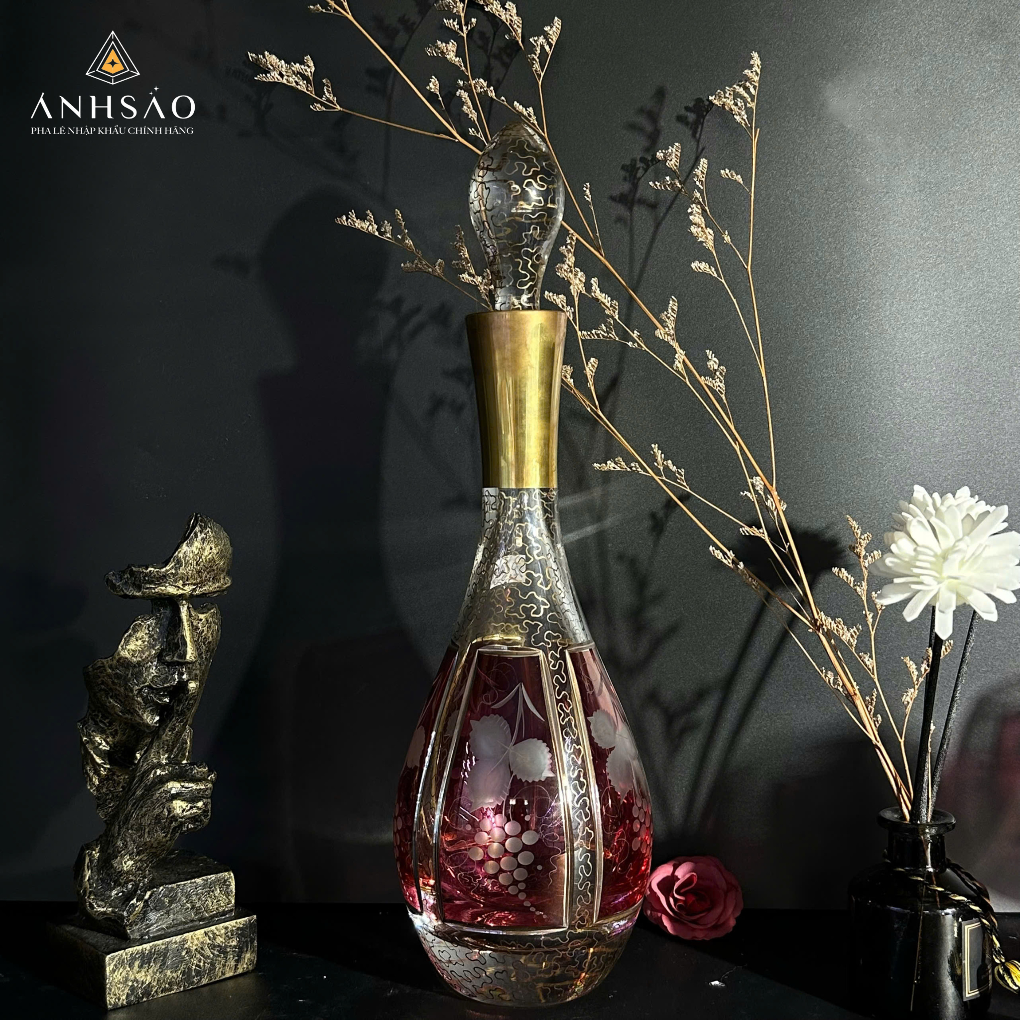 Bộ Bình Rượu Pha Lê Mài Vẽ Chùm Nho hội tụ kỹ nghệ chế tác pha lê truyền thống và thẩm mỹ trang trí tinh xảo, là điểm nhấn hoàn hảo cho không gian tiếp khách sang trọng. Chiếc bình có phom dáng cổ điển uyển chuyển, cổ thon kéo dài, nắp đậy đi kèm giúp bảo quản hương rượu. Trên nền pha lê ruby trong suốt, từng ô mài vẽ chùm nho và lá nho hiện lên rõ nét — biểu tượng của trổ quả, sung túc và dư dả — tạo nên câu chuyện thị giác giàu cảm xúc mỗi khi ánh sáng chiếu qua.