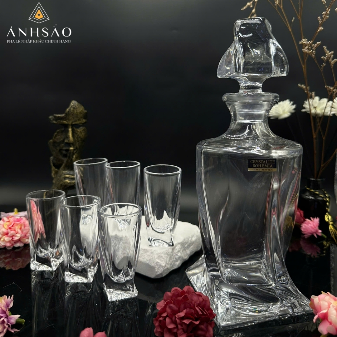 Bộ bình rượu pha lê Bohemia dáng xoáy là sự kết hợp tuyệt vời giữa nghệ thuật thủ công truyền thống và thiết kế hiện đại. Mang trong mình nét tinh xảo của pha lê Tiệp Khắc trứ danh, bộ sản phẩm gồm một bình rượu lớn với nắp đậy chắc chắn và sáu ly nhỏ đi kèm, được chế tác từ pha lê không chì an toàn cho sức khỏe và có độ trong suốt tuyệt vời.