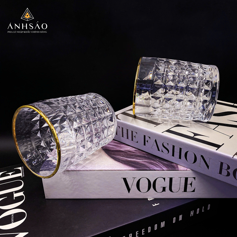 Đặc điểm nổi bật: Họa tiết mài sâu, dày dặn, tạo cảm giác cầm chắc tay. Viền vàng được mạ tỉ mỉ, giúp cốc pha lê phản chiếu ánh sáng rực rỡ hơn.