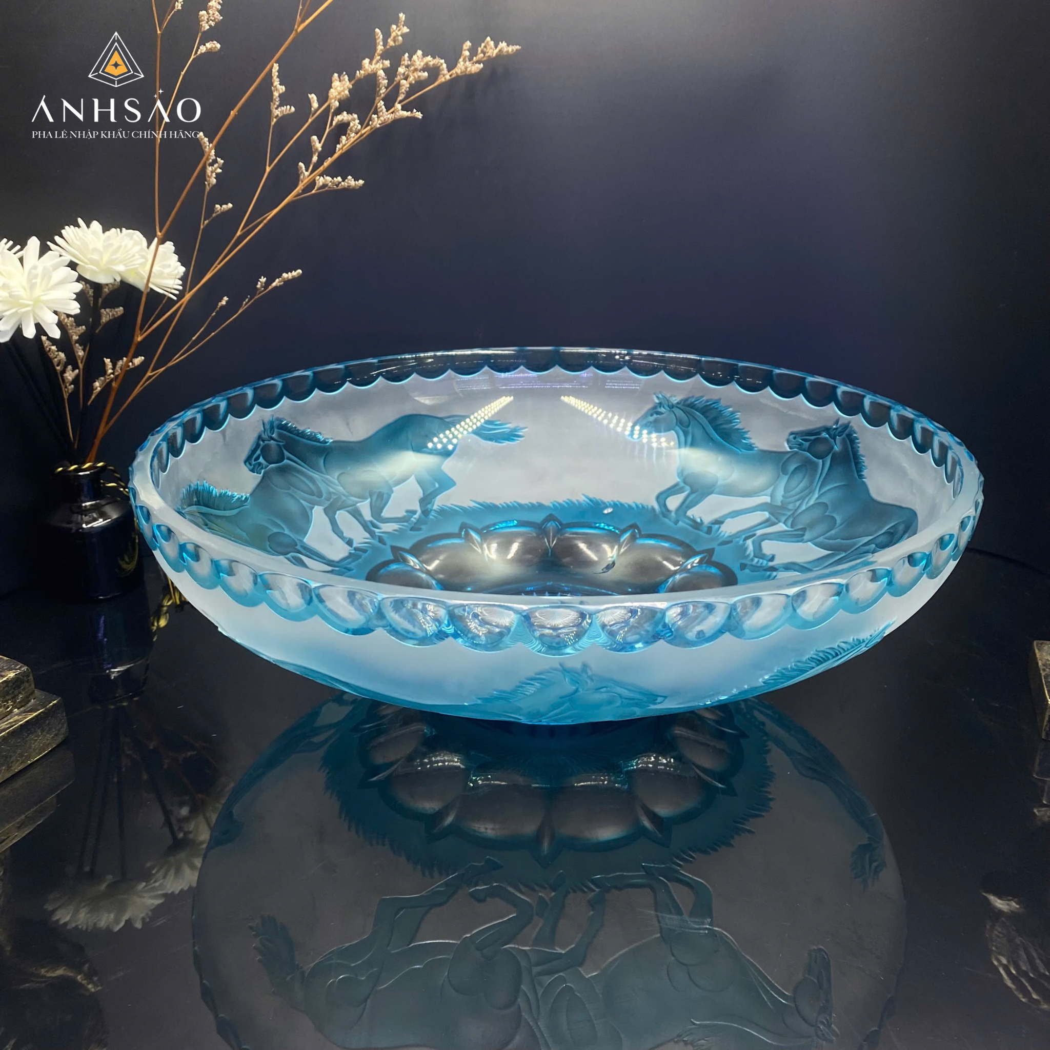 Tiếp theo là âu pha lê Haida xanh điêu khắc ngựa, nổi bật với gam màu xanh ngọc trong trẻo và họa tiết ngựa mạnh mẽ được chạm khắc tỉ mỉ. Mẫu âu pha lê này không chỉ thể hiện sự tự do, phóng khoáng mà còn mang ý nghĩa phong thủy về tài lộc và thịnh vượng, rất thích hợp để trang trí trên bàn tiếp khách hoặc kệ trưng bày.