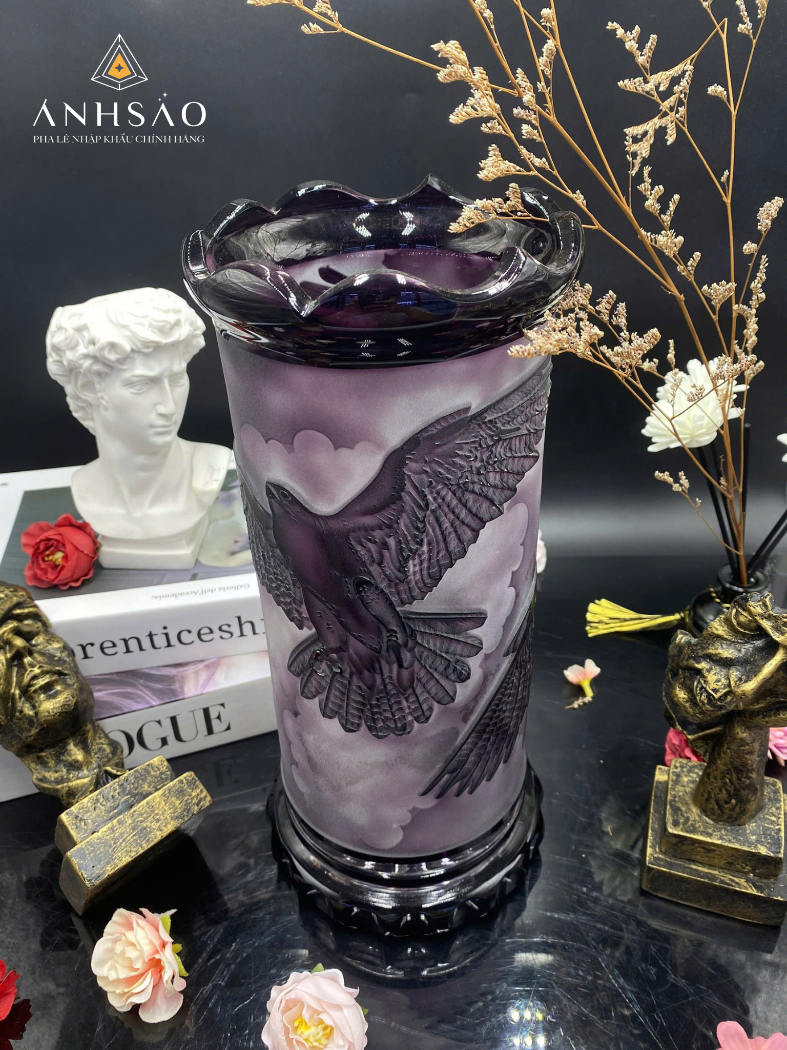 Thiết kế trụ chắc khỏe với miệng lượn sóng gợi hình đỉnh núi. Lớp phủ tím than chuyển sắc kết hợp bề mặt khắc mờ tạo “phông mây”, nổi bật phù điêu chim ưng sải cánh. Khi đặt gần nguồn sáng, lọ hoa pha lê này cho hiệu ứng tương phản mạnh: vùng mờ dịu làm nền, còn phần phù điêu và viền miệng bắt sáng sắc nét, rất phù hợp làm điểm nhấn ở sảnh, console hay kệ TV.