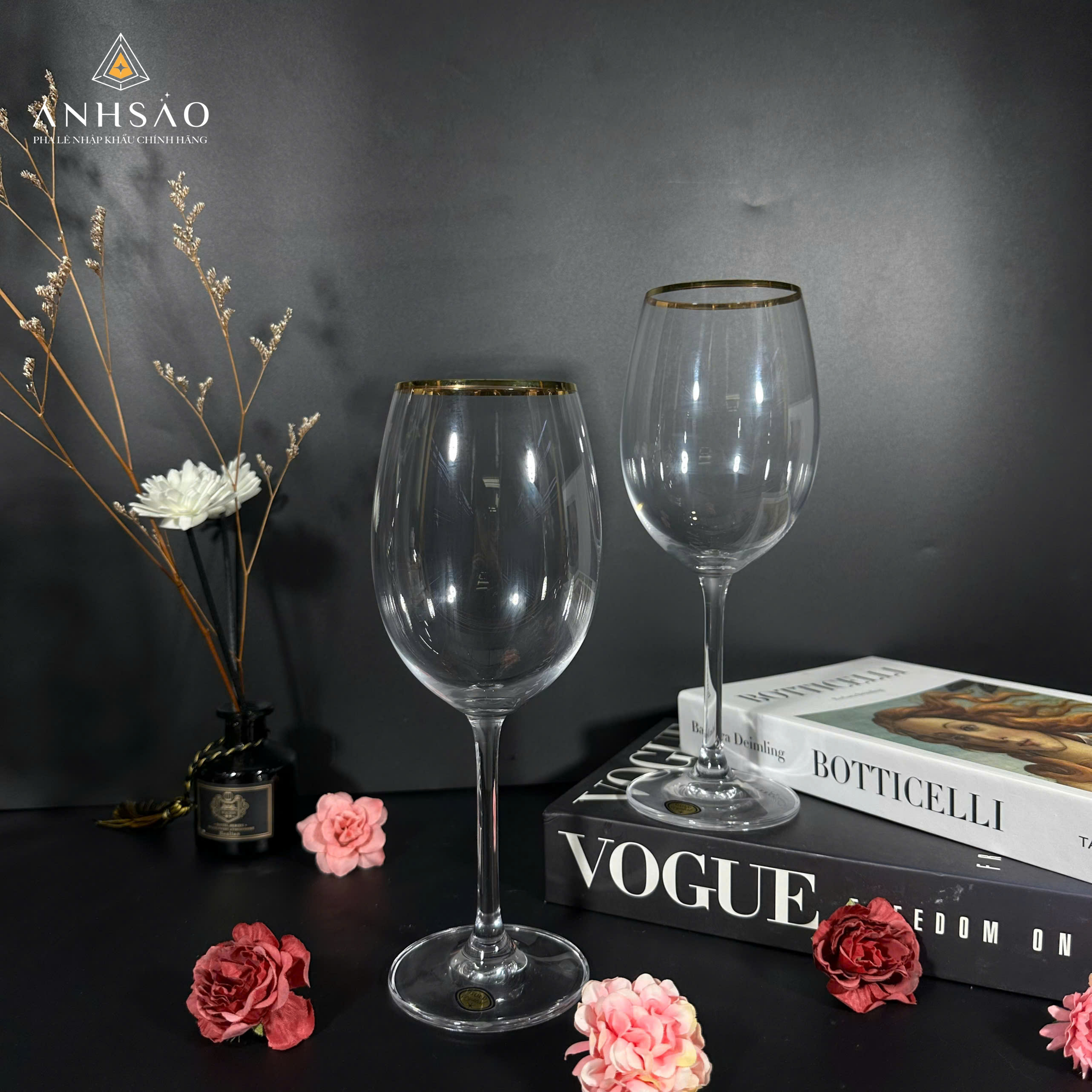Tiếp đến là ly pha lê viền vàng – biểu tượng của sự quý phái và sang trọng. Đường viền mạ vàng tinh xảo trên miệng ly được làm thủ công, thể hiện đẳng cấp của người sử dụng và nâng tầm mọi loại rượu vang khi rót ra.