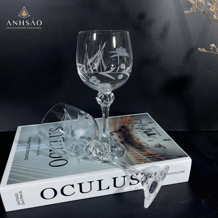 Mẫu thứ hai là bộ ly pha lê uống vang với thiết kế tròn rộng, giúp hương rượu lan tỏa tự nhiên và trọn vẹn hơn. Thân ly được chạm khắc hoa văn lá và quả vô cùng tinh tế, thể hiện kỹ nghệ chế tác thủ công truyền thống nổi bật. Chân ly được tạo hình đa giác sang trọng, nâng đỡ chiếc ly đầy vững chãi, mang đến cảm giác hài hòa giữa tính nghệ thuật và công năng sử dụng. Bộ ly pha lê này phù hợp với những bữa tiệc gia đình, buổi thưởng rượu nhẹ nhàng hay dùng làm quà tặng tri ân cao cấp.