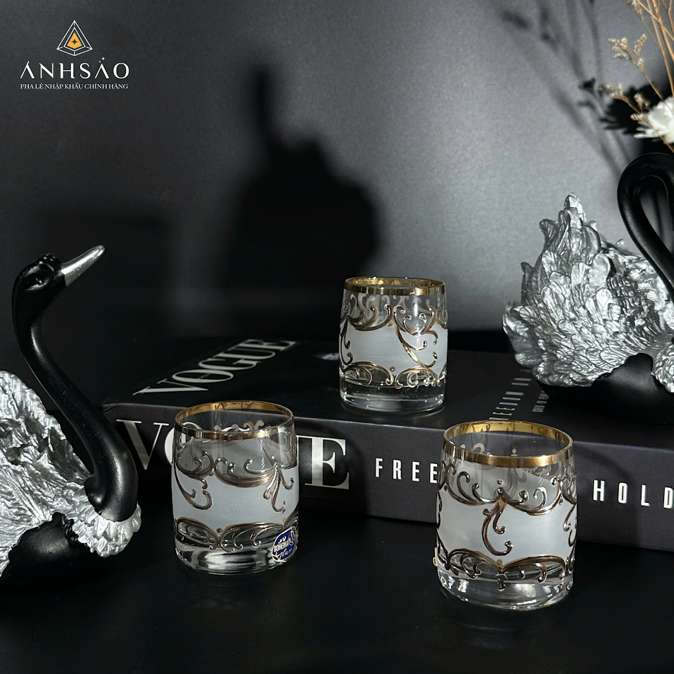 Điều làm nên sự độc đáo của chiếc chén pha lê này là kỹ thuật xử lý bề mặt. Phần thân chén pha lê được phủ một lớp mờ (frosted) tinh tế, tạo cảm giác mờ ảo, dịu dàng, đối lập hoàn toàn với độ trong suốt ở đáy ly. Lớp mờ này không chỉ mang tính thẩm mỹ mà còn giúp giảm độ trơn trượt khi cầm.Trên nền mờ ảo đó, những hoa văn xoắn ốc kiểu Baroque, uốn lượn mềm mại và được mạ vàng hoặc bạch kim, nổi bật lên như những nét vẽ của họa sĩ tài ba. Ánh kim loại ấm áp hòa quyện với vẻ tinh khiết của pha lê tạo nên một tổng thể hài hòa, cổ điển mà không hề lỗi thời. Chiếc chén pha lê này gợi lên sự xa hoa thầm kín, dành cho những người ưa chuộng sự kín đáo nhưng vẫn muốn khẳng định đẳng cấp.