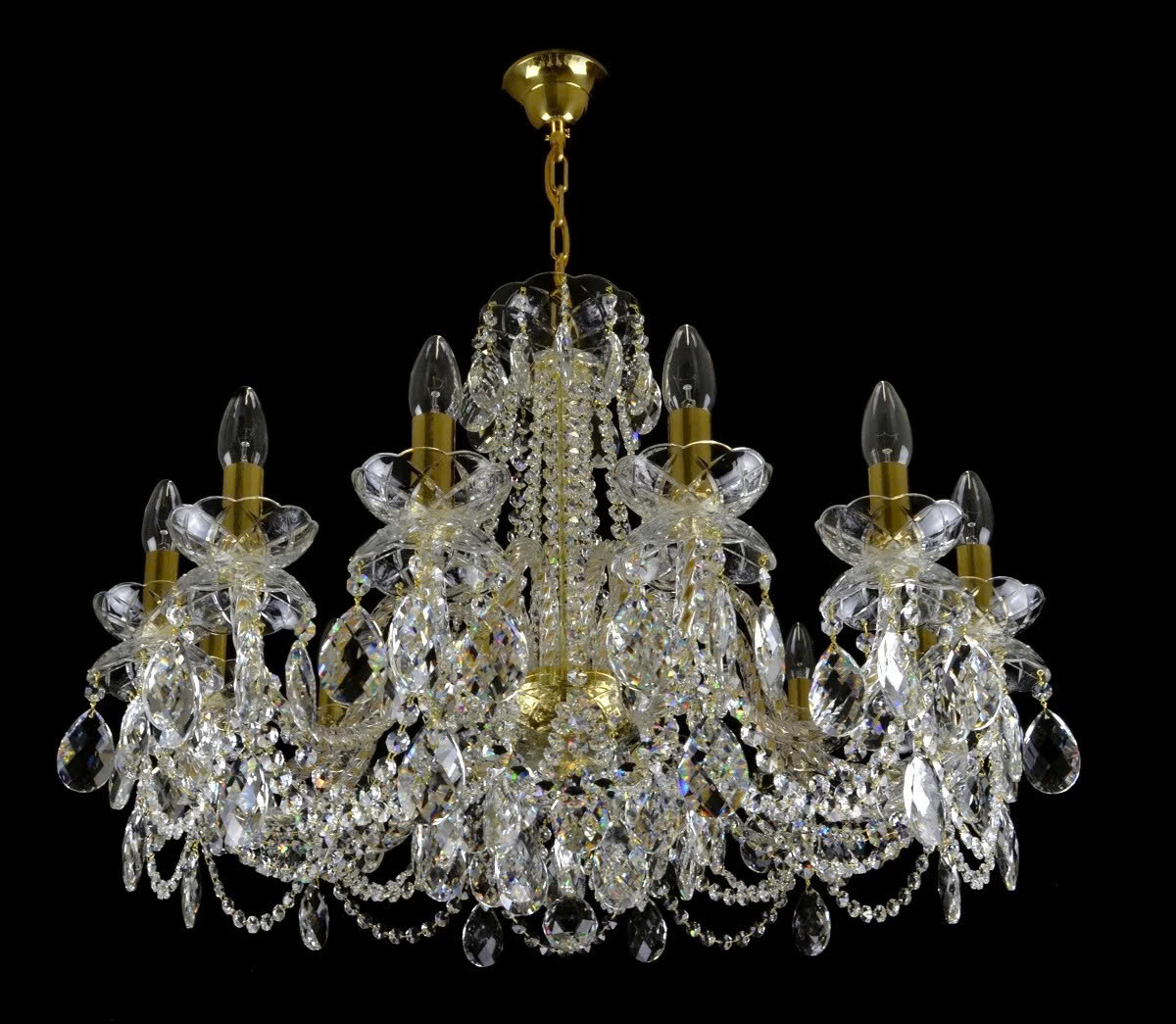 Đèn pha lê Maniera Beta sở hữu 12 tay đèn uốn cong như những cánh hoa vàng bung nở từ trung tâm. Mỗi đĩa đỡ pha lê được tạo hình tinh xảo, nâng đỡ từng chuỗi pha lê rũ xuống đầy đặn. Đèn pha lê với tông vàng thống trị toàn bộ chi tiết, từ xích treo đến trụ chính, mang phong thái hoàng tộc không thể nhầm lẫn.