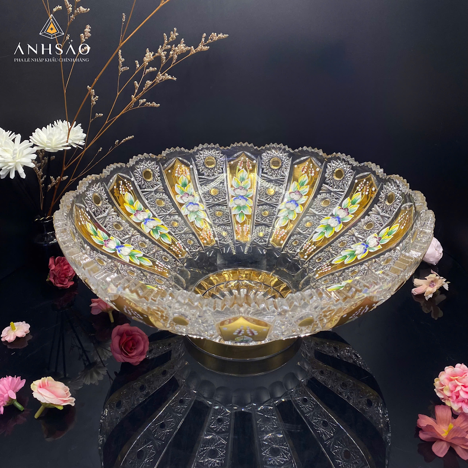 Mẫu đĩa pha lê độc đáo và quý giá thể hiện sự kết hợp hoàn hảo giữa kỹ thuật mài pha lê và nghệ thuật vẽ tay. Đĩa pha lê được đặt trên một chân đế vững chãi, với các mặt cắt sắc nét làm nền. Điểm nhấn là những họa tiết hoa lá được vẽ tay tỉ mỉ bằng màu men vàng rực rỡ và đa sắc, tạo nên một tác phẩm đĩa pha lê. Sự kết hợp của ánh sáng lấp lánh từ pha lê và sắc vàng ấm áp từ họa tiết vẽ tay mang lại vẻ đẹp lộng lẫy, kiêu sa. Đây là lựa chọn lý tưởng cho những không gian cần sự nổi bật và đẳng cấp, và là món quà tặng pha lê vô giá.