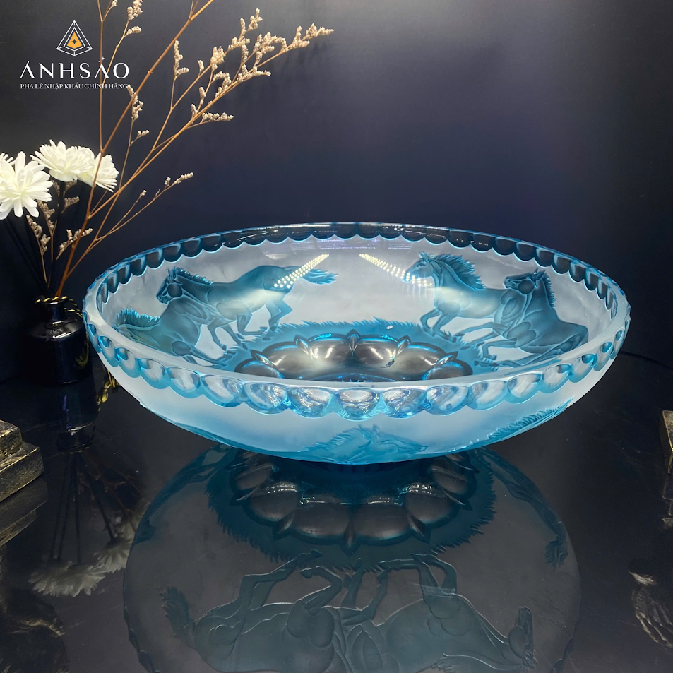 Mẫu đĩa pha lê này gây ấn tượng mạnh mẽ với sắc xanh dương huyền bí và thiết kế hình bầu dục độc đáo. Điểm nhấn nổi bật nằm ở nghệ thuật mài thủ công tinh xảo, tái hiện hình ảnh những chú Ngựa đang phi nước đại mạnh mẽ. Sắc xanh mờ của pha lê không chỉ tạo nên vẻ ngoài cổ kính, quý phái mà còn mang ý nghĩa của sự bình an. Đĩa pha lê này không chỉ là một vật phẩm trang trí mà còn là một sản phẩm trưng bày nghệ thuật. Khi ánh sáng chiếu vào, ánh sáng pha lê từ đĩa pha lê mang lại cảm giác thư thái, dễ chịu, rất thích hợp để trưng bày tại phòng khách hoặc bàn làm việc.
