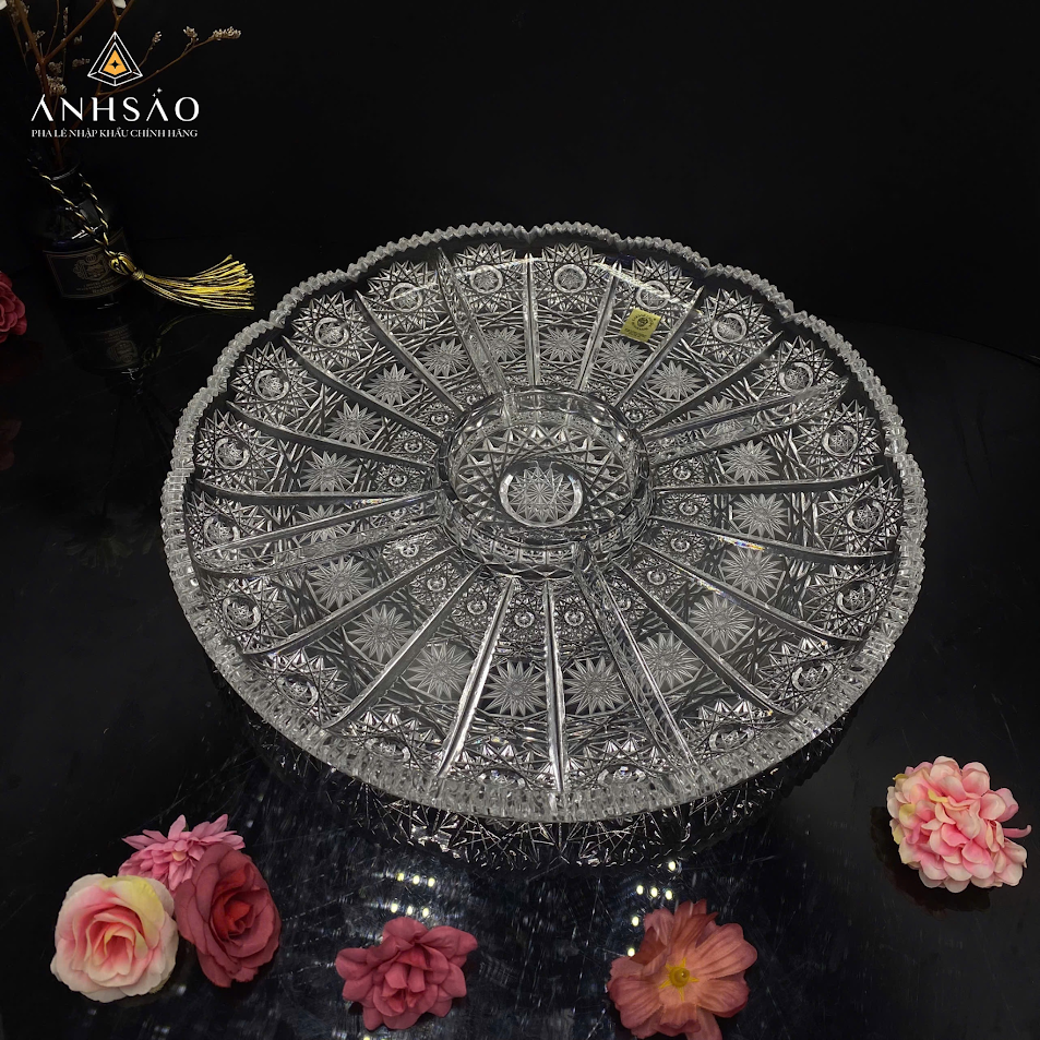 Đĩa pha lê nhiều ngăn này là biểu tượng của vẻ đẹp cổ điển và sự tinh xảo trong nghệ thuật pha lê. Toàn bộ bề mặt chiếc đĩa pha lê tròn lớn được phủ kín bởi những đường chạm khắc sâu và phức tạp, tạo nên những hoa văn pha lê hình hoa tuyết rực rỡ và lấp lánh.
