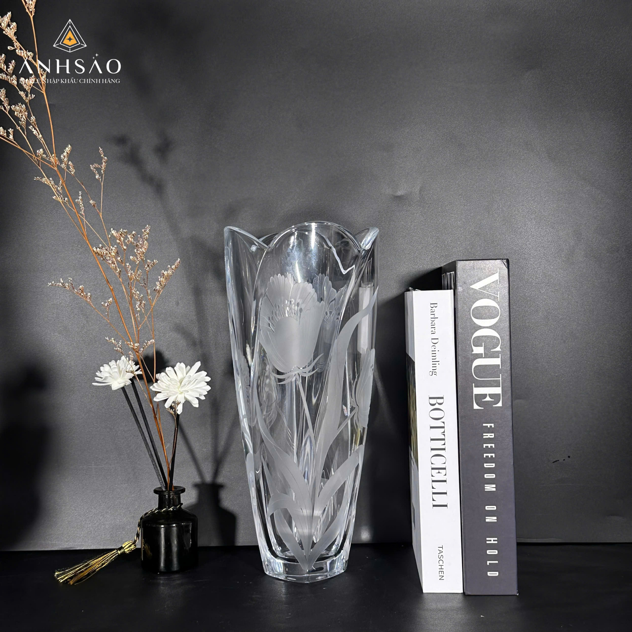 Chiếc lọ được thiết kế theo dáng 4 múi cân đối, tạo nên sự hài hòa và vững chãi trong từng đường nét. Trên bề mặt, những họa tiết hoa tulip được mài khắc thủ công tinh xảo, làm nổi bật sự mềm mại và duyên dáng của loài hoa biểu tượng cho tình yêu, niềm tin và sự thuần khiết. Mỗi chi tiết của lọ hoa pha lê đều được chế tác tỉ mỉ, giúp sản phẩm tỏa sáng lung linh khi tiếp xúc với ánh sáng tự nhiên hay ánh đèn điện.