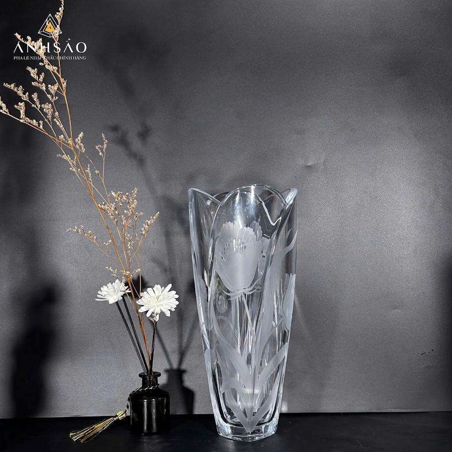 Mẫu lọ hoa pha lê này là sự kết hợp hoàn hảo giữa kỹ thuật chế tác tinh xảo và giá trị thẩm mỹ cao. Họa tiết hoa lớn được khắc tỉ mỉ, tạo chiều sâu và điểm nhấn nổi bật cho sản phẩm. Thiết kế miệng uốn lượn mềm mại giúp tổng thể trở nên sang trọng và khác biệt. Đây là dòng sản phẩm rất được ưa chuộng làm quà tặng cao cấp cho đối tác, khách hàng hoặc dịp tân gia, khai trương.