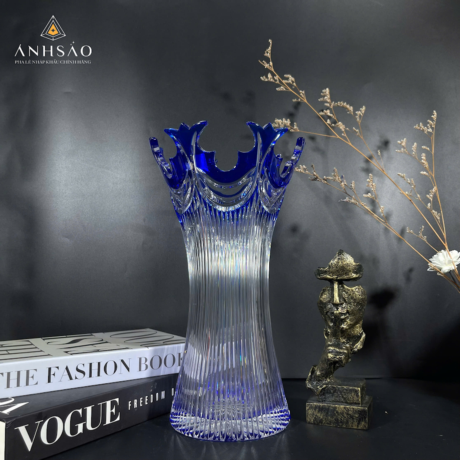 Nếu bạn yêu thích sự nhẹ nhàng nhưng không kém phần nổi bật, mẫu lọ hoa pha lê xanh sapphire là lựa chọn hoàn hảo. Phần thân trong suốt được tạo hình thon gọn, kết hợp sắc xanh ở miệng lọ mang đến cảm giác thanh lịch, hài hòa. Mẫu lọ này đặc biệt phù hợp với không gian tối giản, phòng làm việc hoặc bàn trang trí, giúp không gian trở nên tinh tế và có chiều sâu hơn.