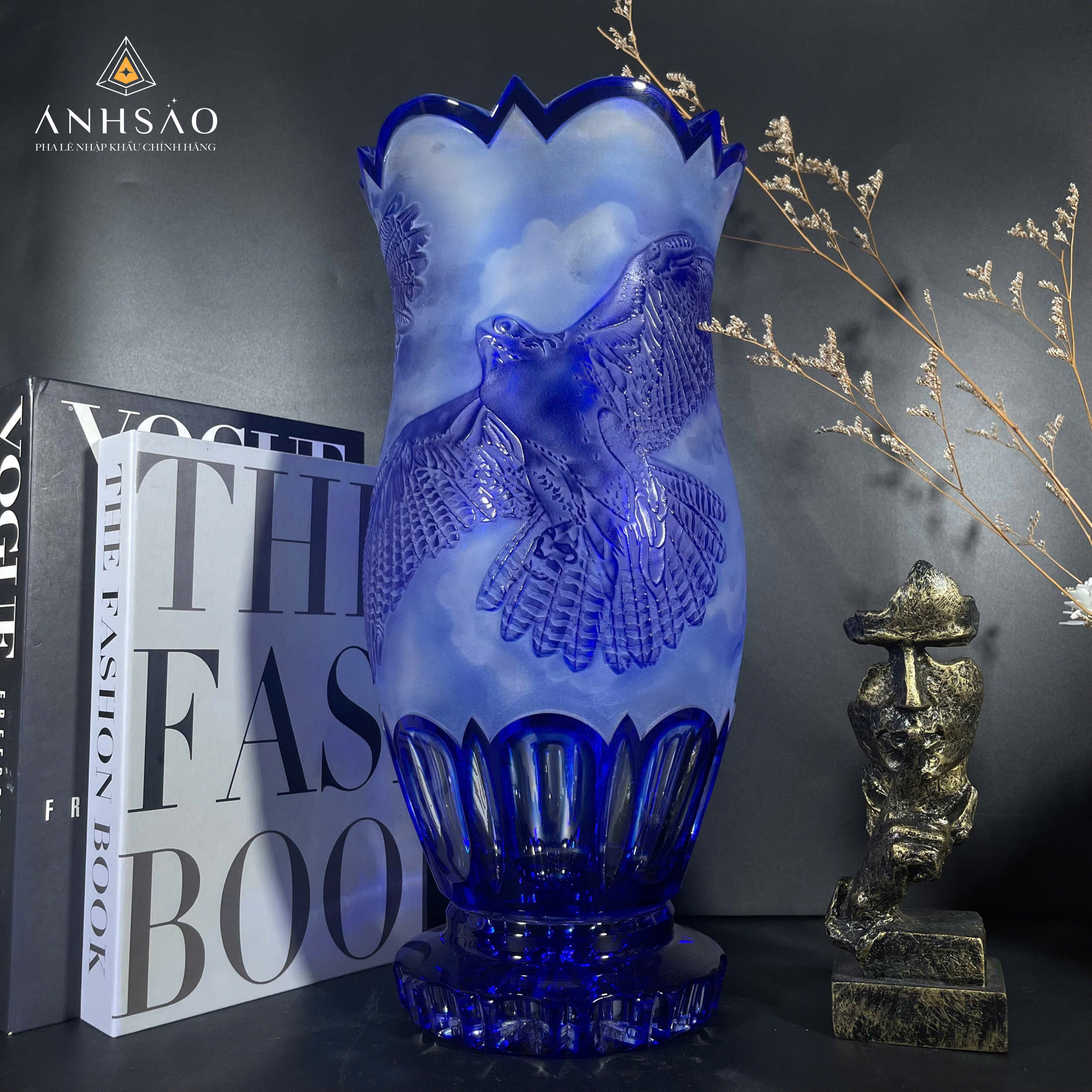 Điểm đặc biệt của lọ hoa pha lê Haida điêu khắc chim ưng chính là gam màu xanh cobalt sâu thẳm, tạo nên cảm giác sang trọng và cuốn hút. Trên thân lọ, hình ảnh chim ưng – biểu tượng của sức mạnh, quyền lực và tự do – được điêu khắc tỉ mỉ bằng kỹ thuật thủ công tinh xảo. Họa tiết này không chỉ thể hiện trình độ nghệ nhân bậc thầy mà còn mang ý nghĩa phong thủy may mắn và bảo vệ bình an.