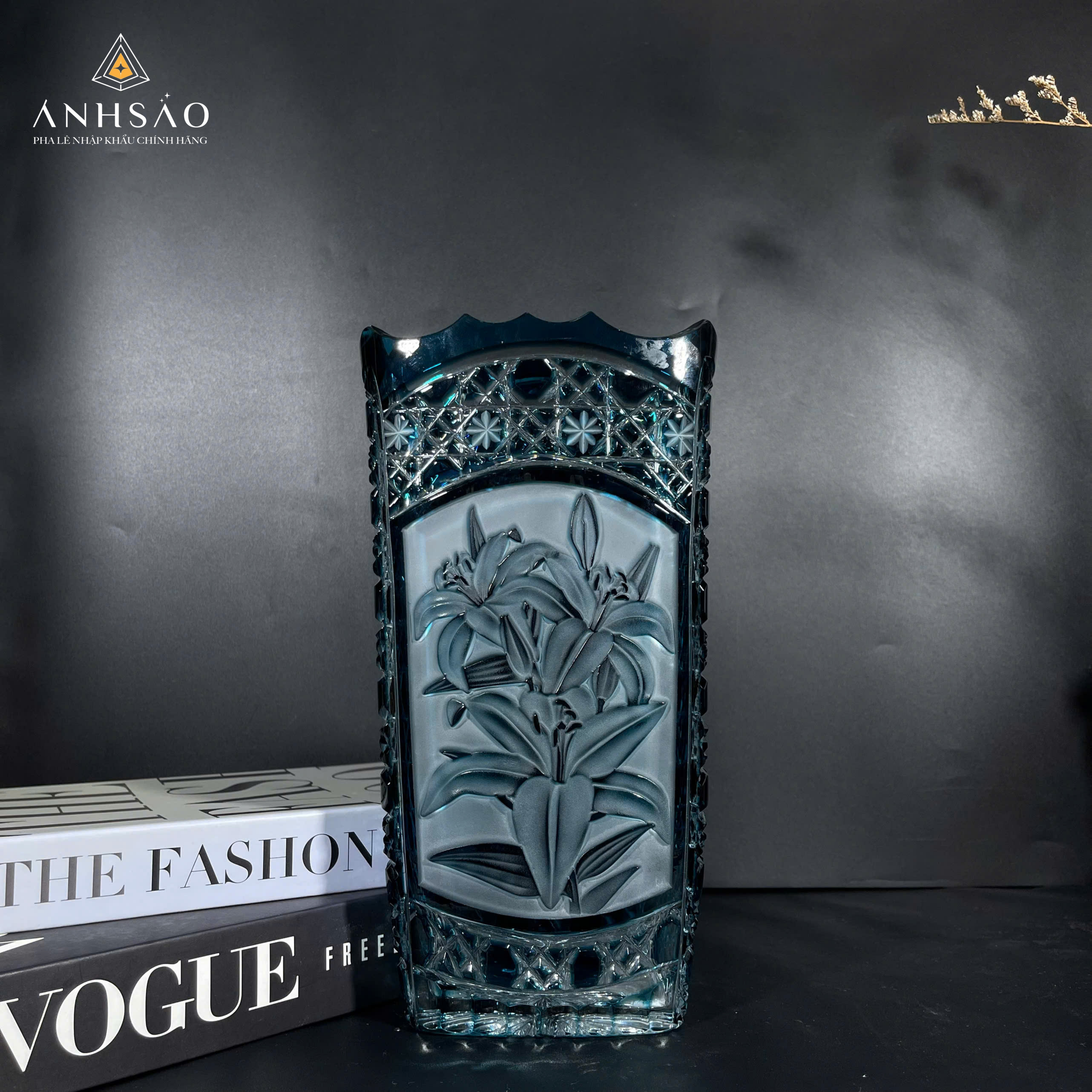 Điểm nhấn đặc trưng của lọ hoa pha lê này nằm ở thiết kế vuông độc đáo, mạnh mẽ nhưng vẫn mềm mại nhờ những đường mài hoa văn tinh xảo. Họa tiết hoa ly được khắc sâu trên thân lọ, tượng trưng cho sự thuần khiết, quý phái và niềm kiêu hãnh – một lựa chọn hoàn hảo để tôn lên nét sang trọng của không gian sống.