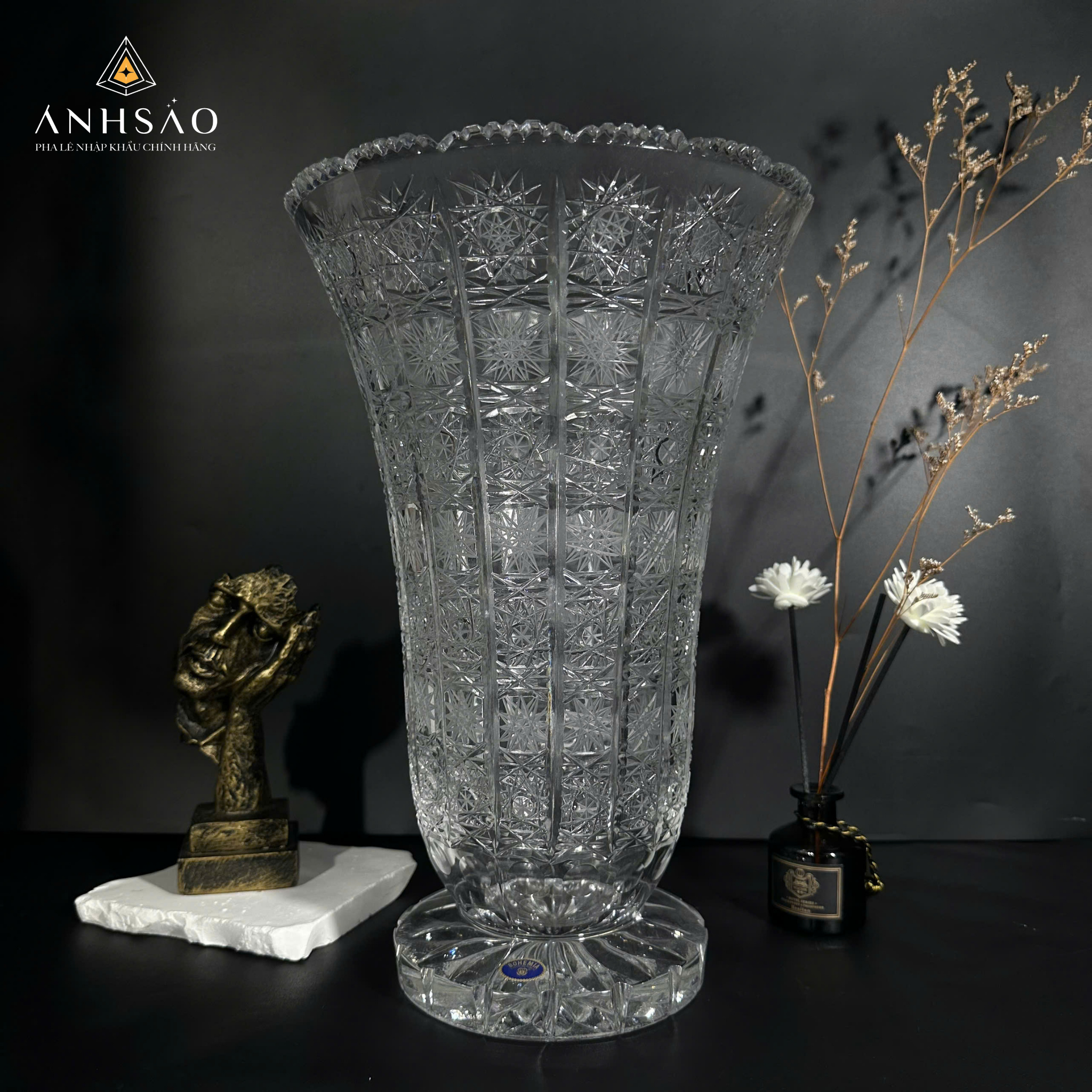 Điểm nhấn đặc biệt của lọ hoa pha lê chính là thiết kế loe miệng mềm mại kết hợp với các đường mài 57 thủ công tinh xảo. Hoa văn mài tỉ mỉ tạo nên hiệu ứng ánh sáng lấp lánh, mang lại cảm giác sang trọng, quý phái và nghệ thuật. Phần chân đế chắc chắn giúp lọ hoa cân đối, an toàn và bền đẹp theo thời gian.