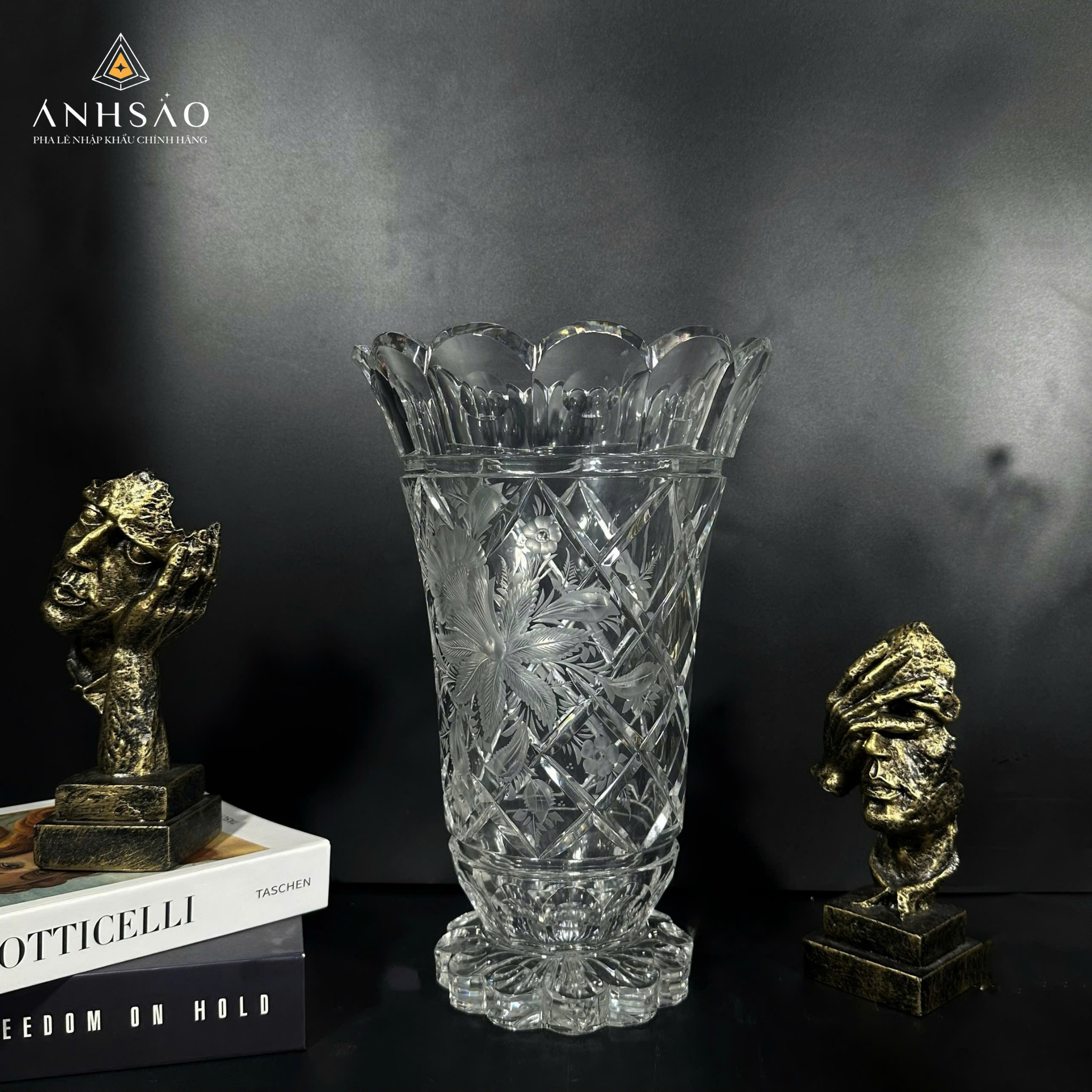 Điểm nhấn nổi bật của lọ hoa pha lê chính là kỹ thuật mài thủ công tỉ mỉ. Những họa tiết hoa lá và hình khối sắc nét được khắc chạm tinh xảo, tạo nên hiệu ứng phản chiếu ánh sáng lung linh, làm không gian trở nên sang trọng và cuốn hút hơn. Phần miệng lọ được thiết kế uốn cong mềm mại, kết hợp với thân lọ dáng cao thanh lịch và chân đế vững chắc, mang đến tổng thể hài hòa và cân đối.