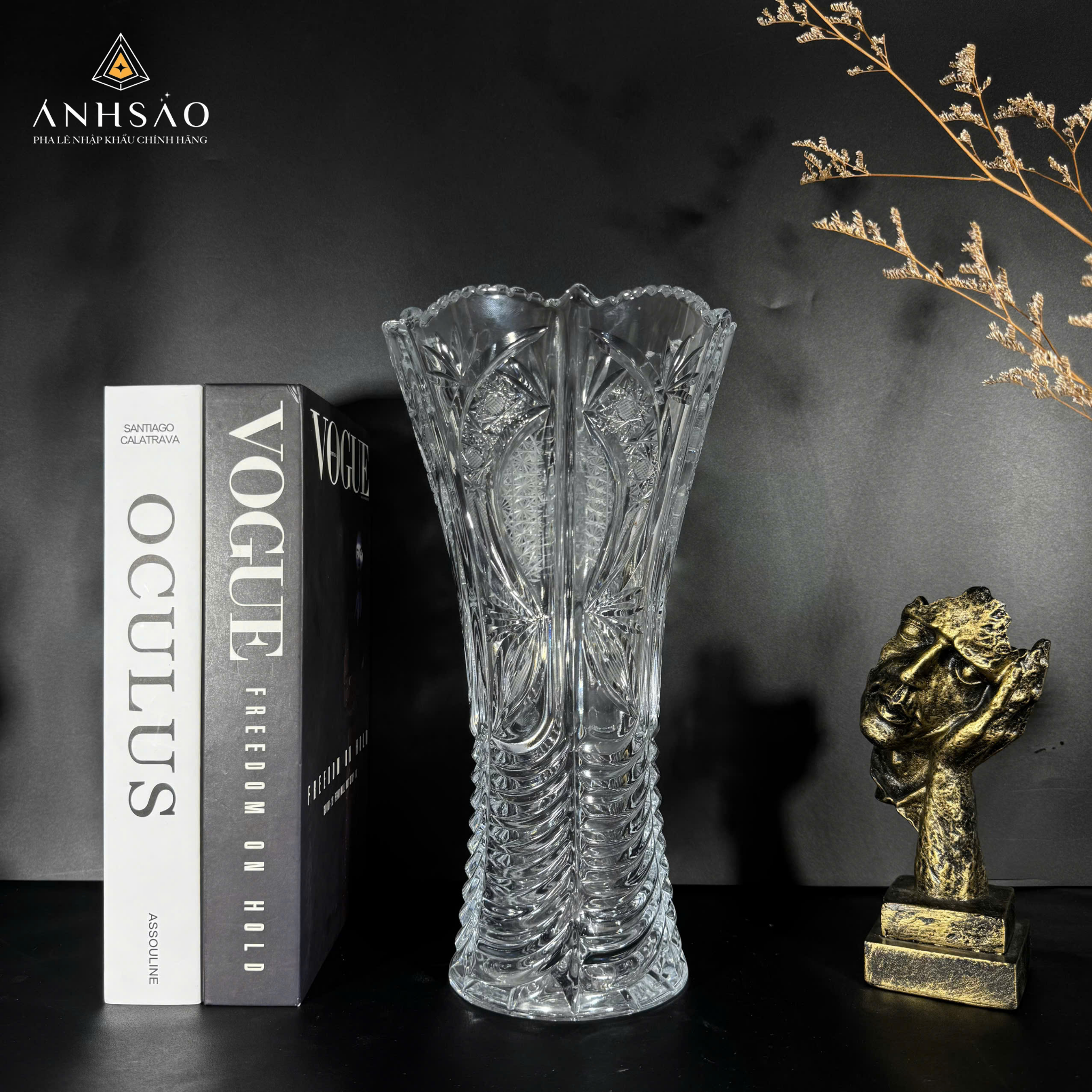 Sản phẩm sở hữu dáng lọ bó uyển chuyển, miệng loe nhẹ nhàng như cánh hoa nở, vừa mềm mại vừa vững chắc. Toàn thân lọ được trang trí bằng những đường mài sắc nét, tỉ mỉ, tạo hiệu ứng ánh sáng lung linh, phản chiếu rực rỡ như những viên kim cương khi đặt dưới ánh đèn. Mỗi chi tiết hoa văn đều được chế tác cẩn thận, tôn lên vẻ đẹp thanh cao, quý phái cho không gian.