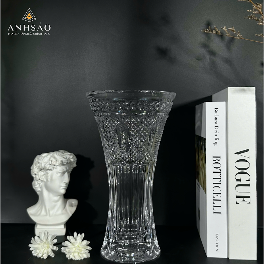 Chiếc lọ đầu tiên trong bộ sưu tập là một mẫu lọ hoa pha lê với đường nét thanh thoát, cổ điển, mang đến cảm giác nhẹ nhàng nhưng vô cùng sang trọng. Với bề mặt được khắc họa những họa tiết đối xứng, chiếc lọ này sẽ tạo điểm nhấn tinh tế cho không gian phòng khách hoặc phòng làm việc. Những đường cắt gọn gàng và lấp lánh ánh sáng giúp chiếc lọ nổi bật mà không cần phải quá cầu kỳ. Đây là một lựa chọn lý tưởng cho những ai yêu thích sự tối giản nhưng vẫn muốn mang lại vẻ đẹp sang trọng cho không gian.