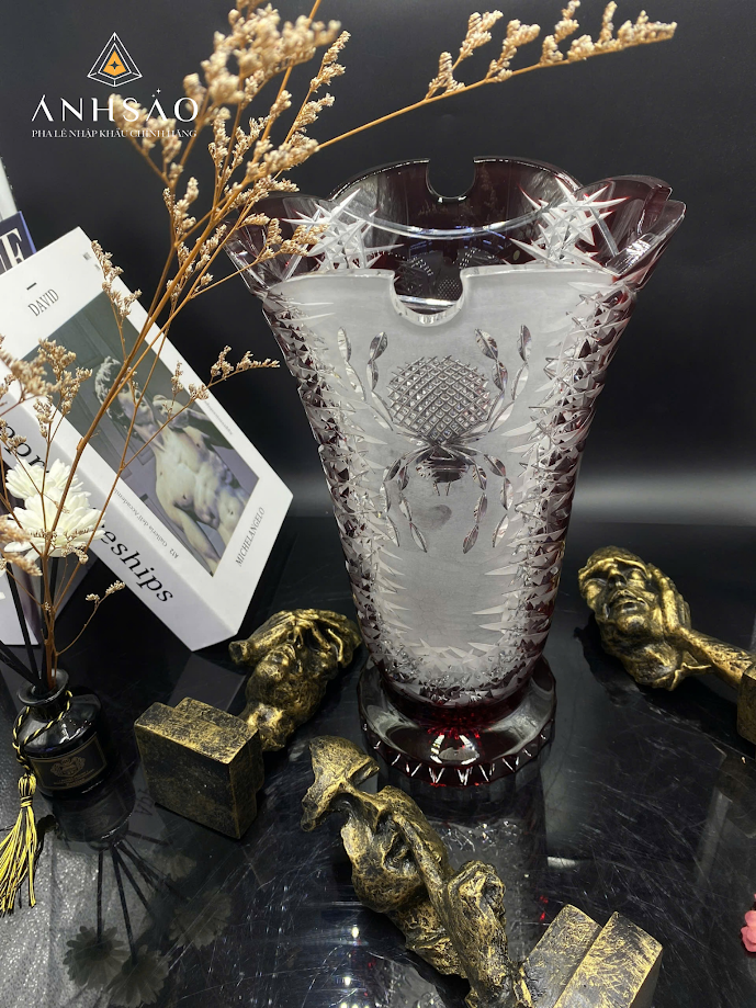 Chiếc lọ hoa pha lê cắt tay với gam màu đỏ ruby trầm ấm mang đậm phong cách châu Âu cổ điển. Các họa tiết hoa văn sắc nét tạo chiều sâu và hiệu ứng ánh sáng cuốn hút. Sản phẩm đặc biệt phù hợp với không gian nội thất sang trọng, bán cổ điển hoặc làm điểm nhấn trang trí nghệ thuật.