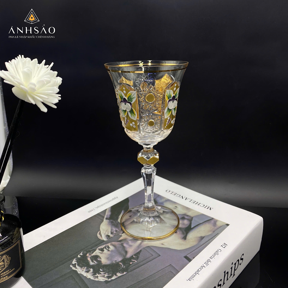 Ly pha lê mài đắp nổi này đại diện cho đỉnh cao của sự xa hoa. Đây là sản phẩm dành cho những người tìm kiếm sự độc đáo, khác biệt và muốn đưa nghệ thuật vào mọi khoảnh khắc. Phần họa tiết được trang trí bằng cách vẽ tay tạo nên màu sắc rực rỡ và một vẻ ngoài "Hoàng gia" không thể nhầm lẫn. Các chi tiết hoa lá, hình học được vẽ tay tỉ mỉ, đòi hỏi kỹ năng cao của nghệ nhân. Sự kết hợp màu sắc đậm và vàng rực rỡ trên nền pha lê trong suốt tạo nên hiệu ứng thị giác mạnh mẽ. Ly pha lê có thêm núm pha lê màu hoặc vàng ở giữa chân ly, làm tăng thêm sự nổi bật và giá trị.