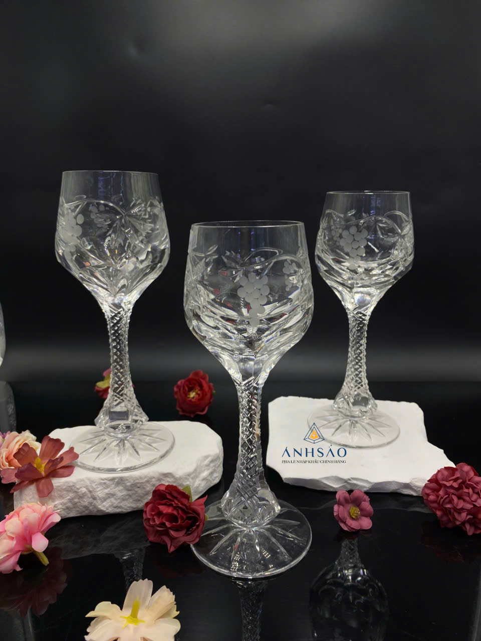 Mẫu ly pha lê thứ hai nổi bật với thiết kế thanh thoát, khắc họa tiết chùm nho – biểu tượng của sự sung túc và may mắn. Thân ly cao giúp giữ rượu ở nhiệt độ lý tưởng và tỏa hương tốt hơn. Kiểu ly này thường dùng cho vang trắng hoặc cocktail, rất phù hợp với những bữa tiệc nhẹ nhàng, tiệc ngoài trời hoặc phong cách hiện đại.