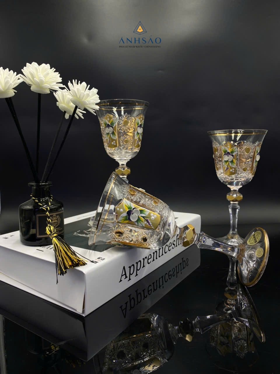 Chiếc ly pha lê đầu tiên gây ấn tượng mạnh với phần viền vàng sang trọng cùng họa tiết hoa văn cổ điển, mang đến vẻ đẹp quý phái và nổi bật trên bàn tiệc. Thân ly được làm từ pha lê Tiệp trong suốt, khúc xạ ánh sáng đẹp mắt, lý tưởng để dùng với rượu vang đỏ hoặc vang sủi. Đây là kiểu ly pha lê thường xuất hiện trong các buổi tiệc cưới, tiệc tối hay sự kiện trang trọng.